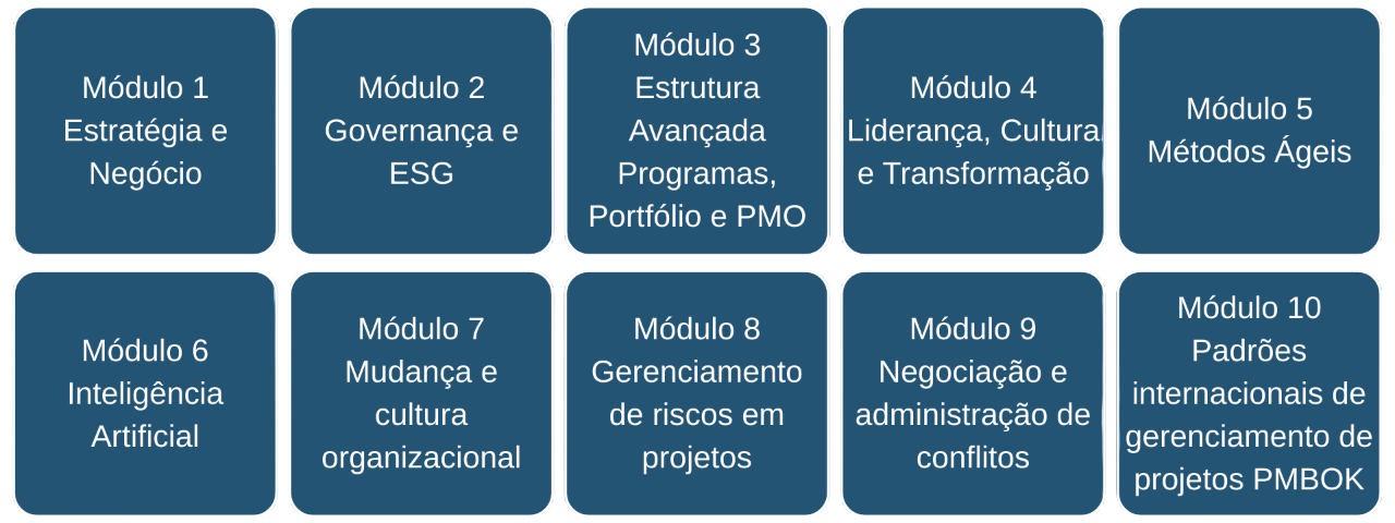 É conectar viabilidade, estratégia, risco, cultura organizacional e resultado financeiro. Este programa entrega a base conceitual das formações mais respeitadas do país. Você não paga pelo nome da instituição.